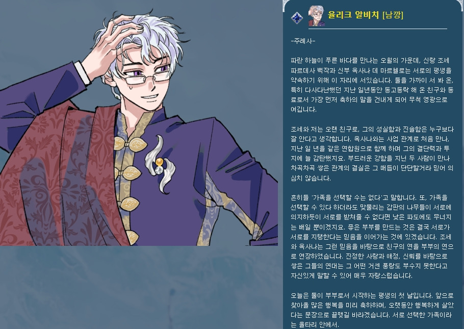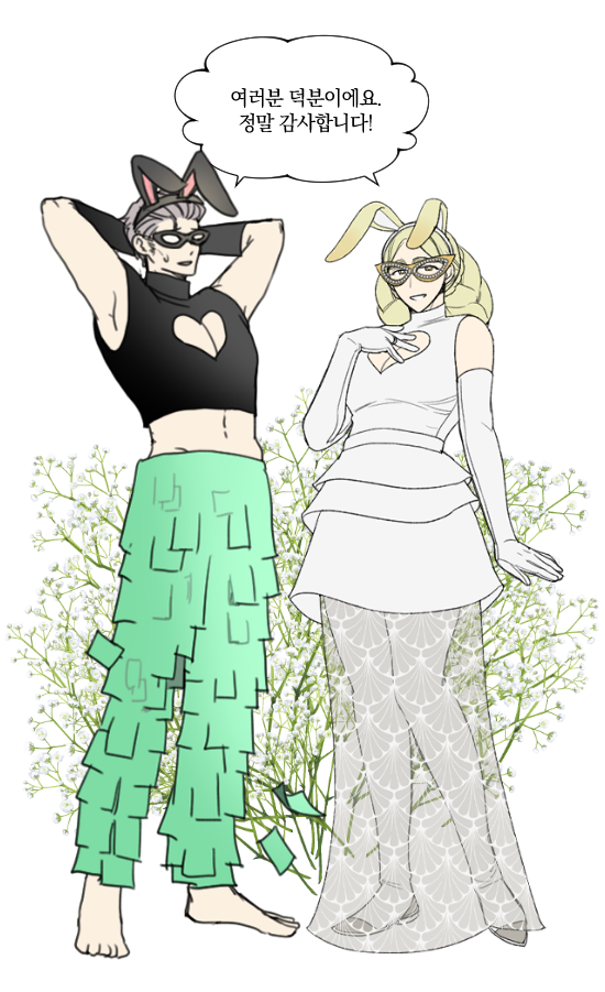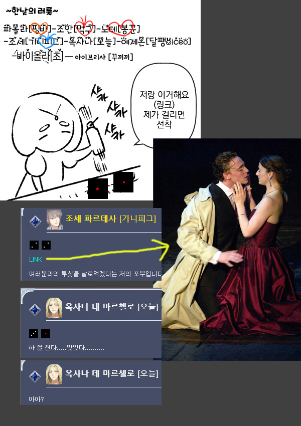게임 벌칙으로 '만취한채 자기 뒷순서에게 캐릭터에게 부축받기' 시츄를 받았는데, 마침 게임당시 뒷순서가 오늘님이셨어서 그리게 됐던 로그입니다.