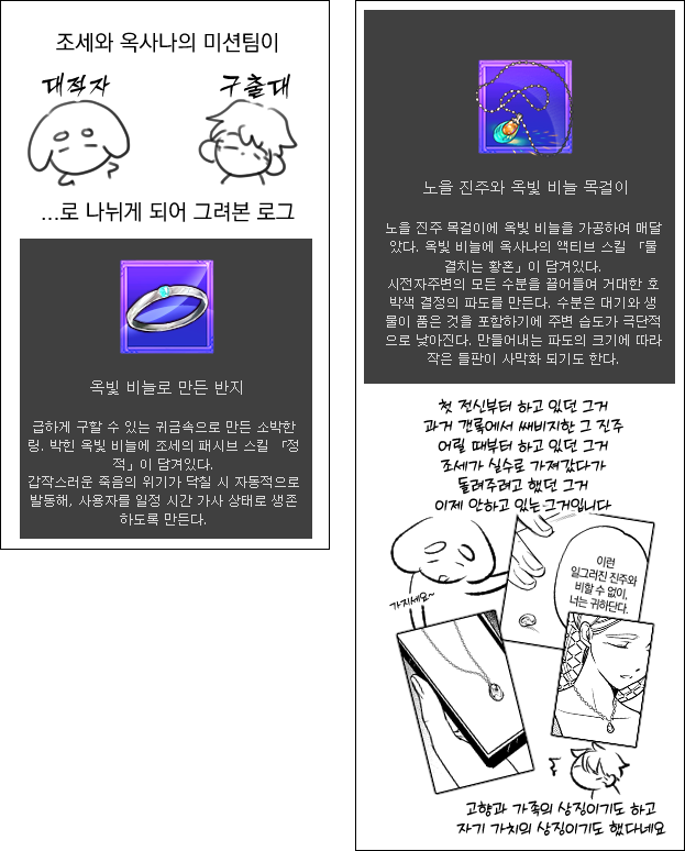 '옥빛비늘'은 자신의 가호를 담으면 타인이 그 힘을 쓸 수 있게 해주는 아이템입니다. 조세는 반지에 자신의 목숨을 살려줬던 가호를 담아 옥사나에게 전달합니다.